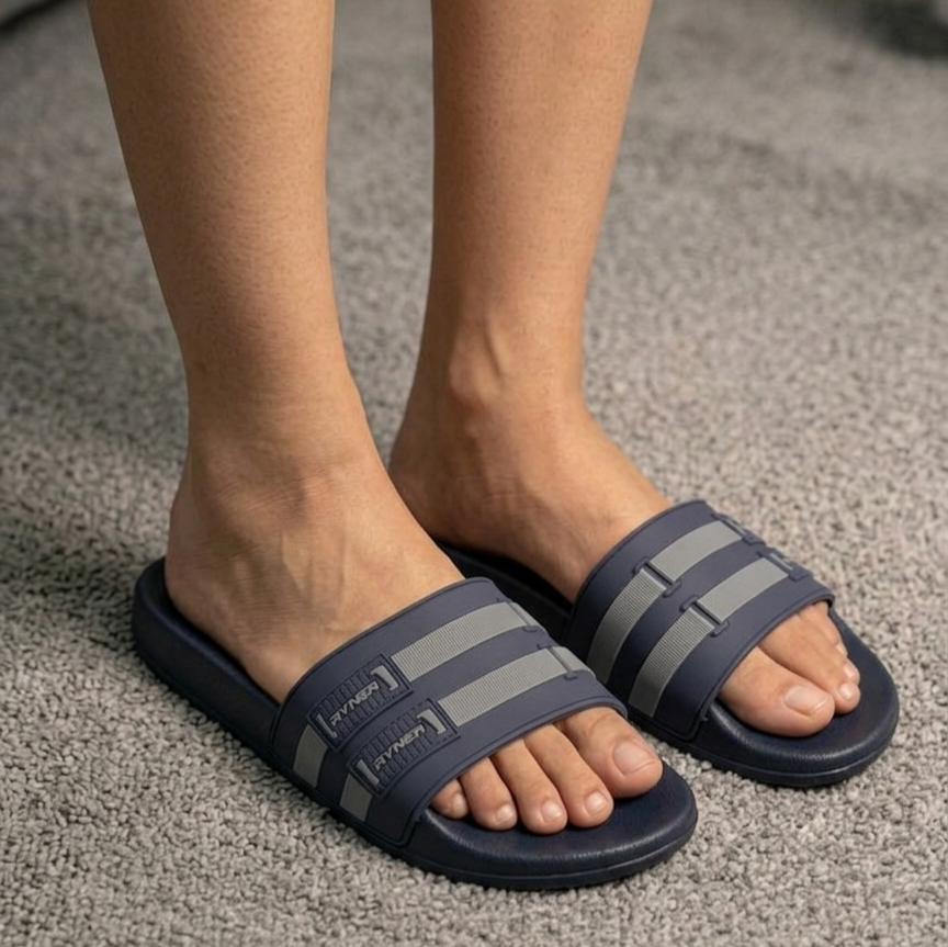 Upgrade your everyday essentials with the Ryner Gray Stripe Comfort Slides, designed for modern style and reliable comfort. Featuring a sleek blue base accented with bold Gray stripe detailing, these slides deliver a sporty, contemporary look that stands out effortlessly.